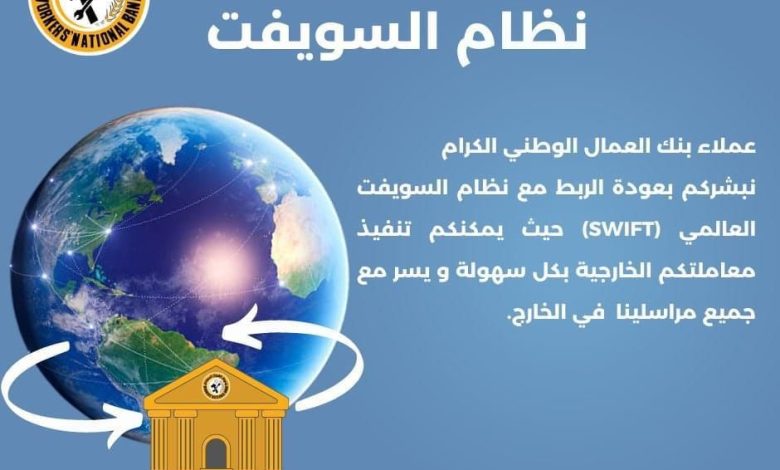 نبشركم بعودة الربط مع نظام السويفت العالمي (SWIFT) حيث يمكنكم تنفيذ معاملتكم الخارجية بكل سهولة و يسر مع جميع مراسلينا في الخارج.