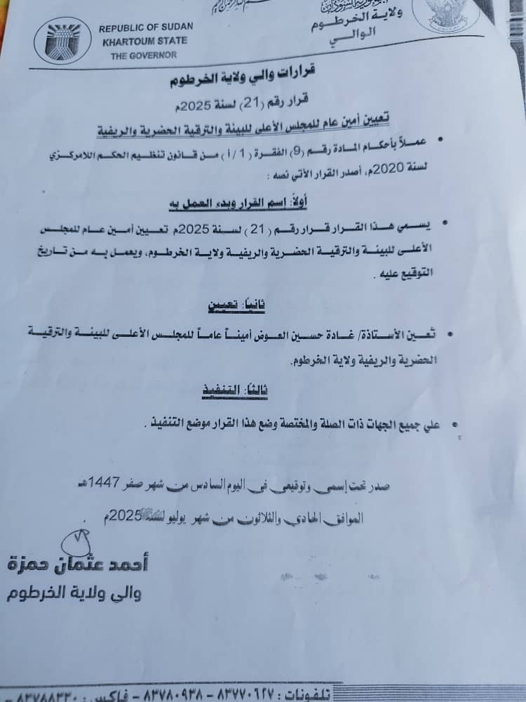 أصدر والي الخرطوم احمد عثمان حمزة اليوم قرارا بتعيين الأستاذه غادة حسين العوض حسن امينا عاما للمجلس الأعلى للبيئة والترقية الحضرية والريفية ولاية الخرطوم.