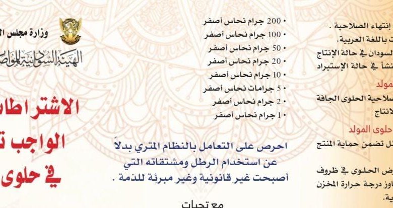 تواصل الهيئة السودانية للمواصفات والمقاييس حملتها القومية الحادية عشرة لتوعية المستهلك لموسم المولد النبوي الشريف 1447هـ ، وقالت الأستاذة رحبة سعيد عبد الله المدير العام أن الحملة تأتي وبلادنا تشهد إستقرارا نسبياً بعد الحرب العنيفة، وأثبتت إرادة الشعب السوداني القوية التي تحدت كل الصعاب مشيرة إلى أن إحتفاء السودانيين بمولد المصطفى صلى الله عليه وسلم نابع من حبه وإتباعه ، مؤكدة أن الحياة الإستهلاكية ورغم المآسي لم ولن تتوقف ، سائلة الله أن يكون الاحتفاء بالمولد بداية لنهاية كل آلام الناس ، وقالت رحبة أن الحملة تهدف للتبصير بالإشتراطات الواجب توفرها في حلوى المولد والتأكيد على عدم استخدام الرطل في المعاملات التجارية مشيرةً لأهمية تنبيه المصنعين بالالتزام بهذه الاشتراطات ، منوهة أنه وخلال الحملات بالولايات المستقرة التي تنفذ بوساطة فريق مشترك بين فروع المواصفات وشرطة مباحث التموين وحماية المستهلك واللجنة القومية لشؤون المستهلكين سيتم جمع كل الأوزان المخالفة ، والتأكيد على أن الكيلو غرام هو معيار الوزن في السودان ، حاثة المستهلكين جميعاً بالتمسك بحقوقهم والشراء بالأوزان المعتمدة . وأشارت رحبة لأهم الاشتراطات الفنية التي نصت عليها المواصفة القياسية السودانية للحلوى م ق س د 4845 /2012 بأن تكون خالية من الكحول و منتجات الخنزيرومشتقاتها، ويجب أن تكون الألوان المستخدمة فيها مسموح بها غذائياً وعدم الإفراط والمبالغة في استخدامها ، وأن تكون خالية من الحشرات وأجزائها والأجسام الغريبة وخالية من المحليات الاصطناعية ، و ألا تكون متميعة أو ملتصقة ببعضها أو بورق التغليف ، يجب ألا تقل نسبة الحُمص فيها عن 18% والسمسم عن20% والفول السوداني عن 18% من الوزن الكلي للحلوى كل على حدا.