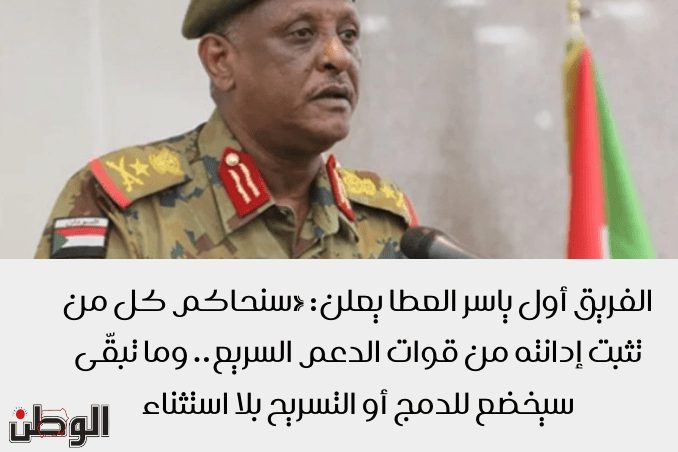 الفريق أول ياسر العطا يعلن: «سنحاكم كل من تثبت إدانته من قوات الدعم السريع.. وما تبقّى سيخضع للدمج أو التسريح بلا استثناء»