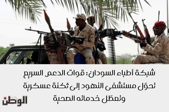 وأشارت الشبكة إلى أن آلاف المواطنين الذين ما زالوا في النهود يعيشون أوضاعًا إنسانية معقدة بسبب صعوبة الوصول إلى العلاج، خاصة في ظل فرض رسوم جديدة، وتوقف برامج التحصين والرعاية الأولية، وتخصيص قسم الطوارئ بالكامل لمنسوبي قوات الدعم السريع.‏‏وفي سياق متصل، ذكرت غرفة طوارئ دار حمر أن قوات الدعم السريع حوّلت جزءًا كبيرًا من المستشفى التعليمي إلى مقر يضم «عناصر أجنبية»، مشيرة إلى تجهيزات عسكرية داخل المباني تشمل أجهزة تشويش، إضافة إلى استخدام أجزاء من المستشفى كمخازن للإمدادات العسكرية.‏‏ودانت شبكة أطباء السودان ما وصفته بـ«انتهاكات جسيمة» للقوانين والمعايير الدولية، مطالبة بانسحاب قوات الدعم السريع فورًا من المستشفى، وإعادته للعمل المدني، وتأمين الكوادر الطبية، واستعادة الخدمات الصحية الأساسية لسكان المدينة دون تمييز.