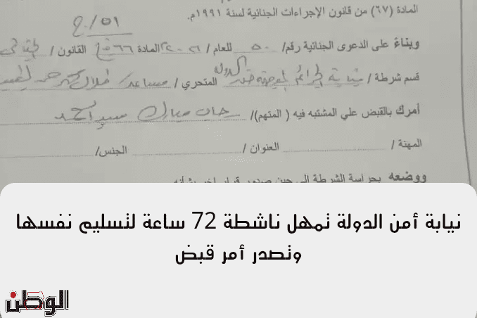 وطالبت النيابة المتهمة بتسليم نفسها والمثول أمامها خلال مدة لا تتجاوز 72 ساعة، كما دعت المواطنين والأجهزة النظامية إلى التعاون في تنفيذ أمر القبض.